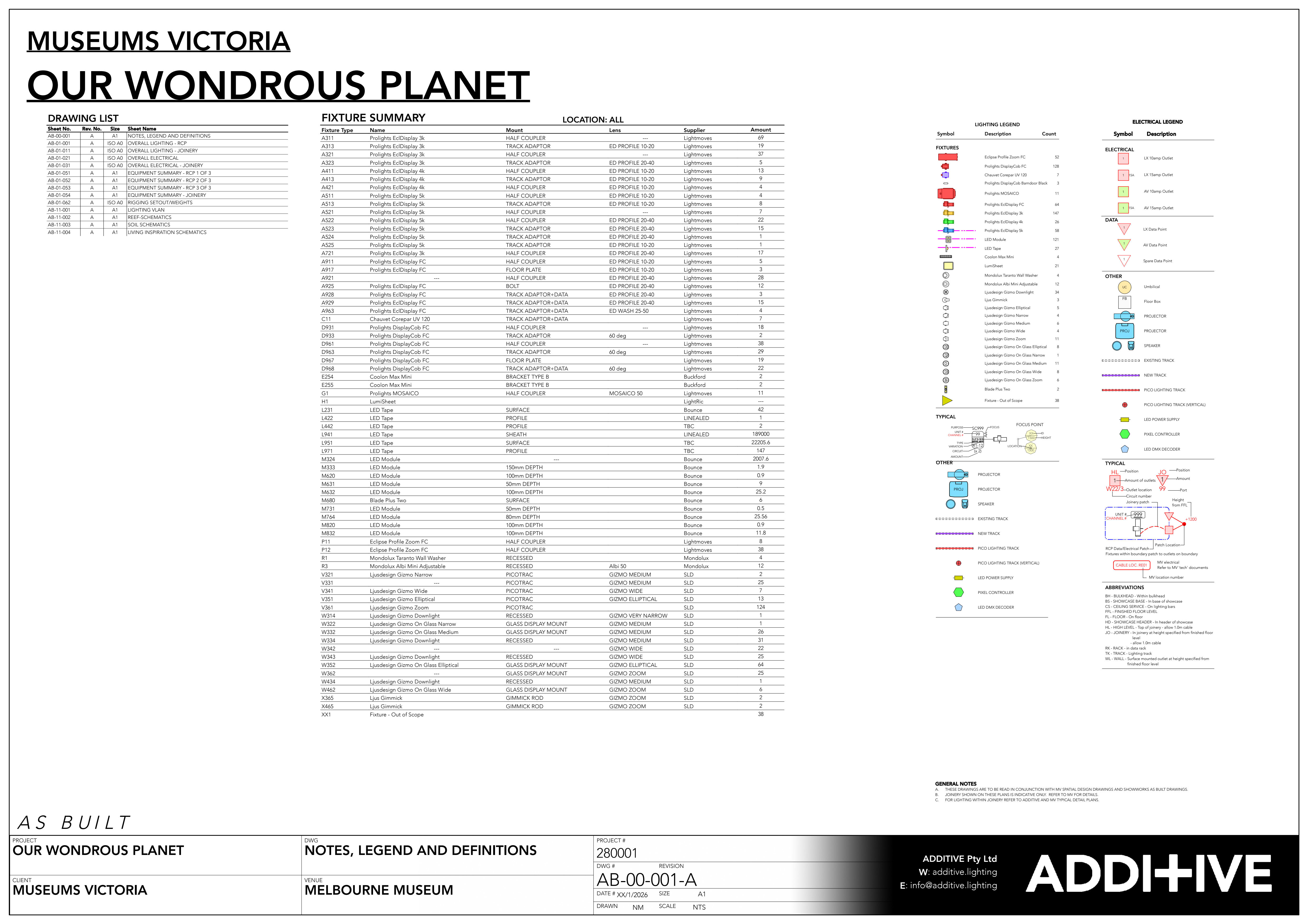 Shaw used Vectorworks Spotlight from early planning through construction and commissioning, building detailed 2D and 3D drawings, schedules, and reports that tracked hundreds of fixtures across the four biomes. In total, the exhibition included roughly 530 gallery fixtures, 380 showcase fixtures, around 240 meters of LED pixel tape, and a wide range of integrated backlit elements. While there were only 11 core fixture types, those expanded into around 70 variants once mounting methods, optics, accessories, and use cases were considered.
