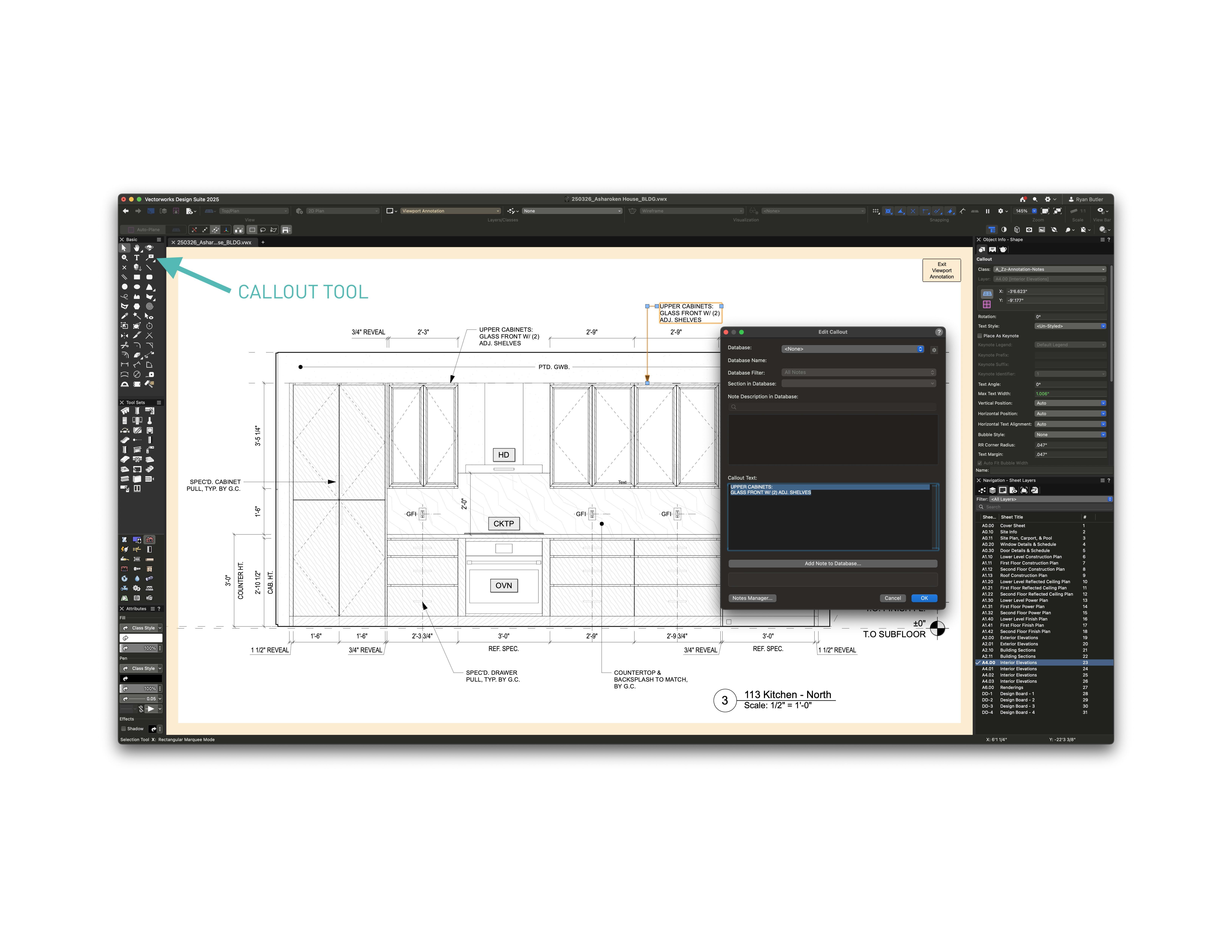 The Callout tool in Vectorworks Architect allows you to place text blocks with leader lines to label objects and add explanatory notes to drawings. Whether you’re detailing construction elements, labeling components, or providing design instructions, this tool helps you create annotations that are clear, consistent, and professional.