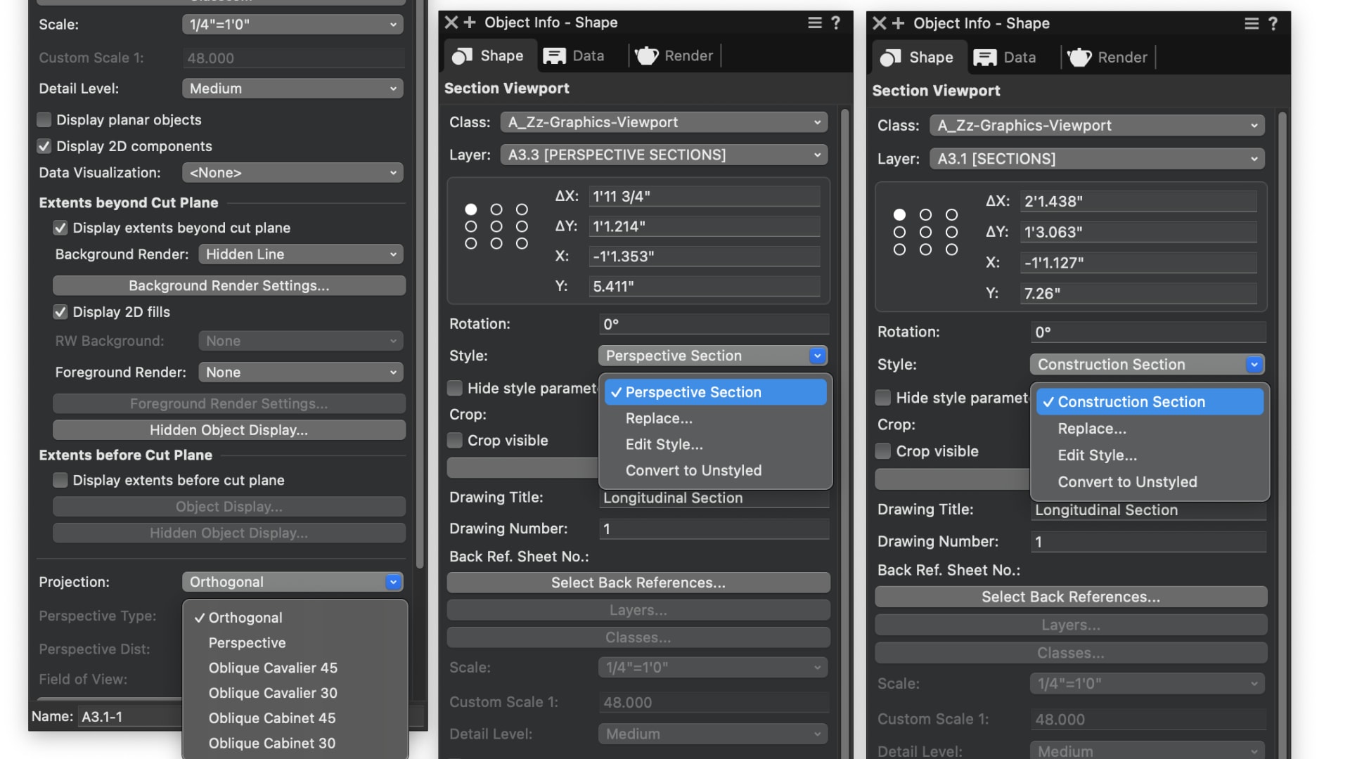 In Vectorworks Architect, you can swap between presentation-style sections and technical, construction sections quickly via the Object Info palette in a Viewport. If you plan on using perspective, presentation-style sections frequently, you can set up a Viewport Style — which you’ll read more about later in this article — ahead of time to be ready for you to use when you need it.