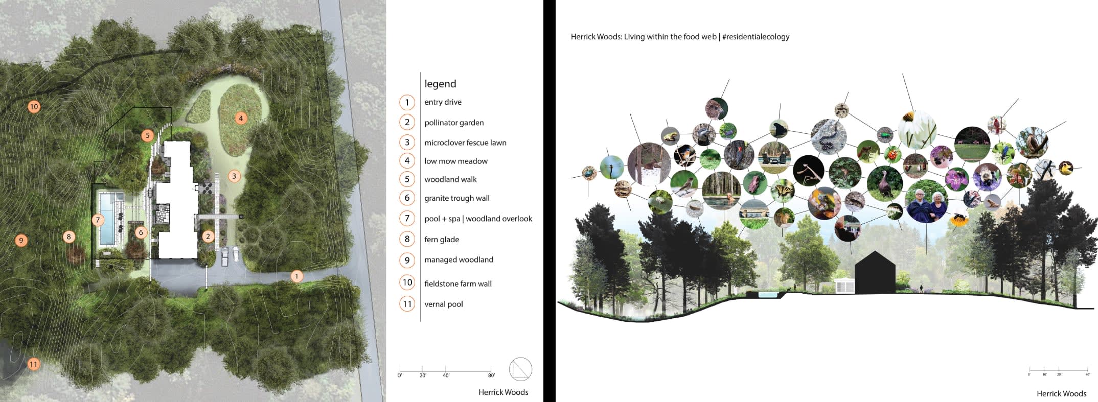 Herrick Woods :ここは「森の実験室」として、ミツバチや蝶など花粉を運ぶ生物のための庭や、マイクロクローバーの芝生、草をあまり刈り込まず自然な状態を保った草地などを設け、生物多様性を育んでいます。森の中の散策路や花崗岩のトラフ(細長い水受け)を組み込んだ壁などの特徴は、自然な水の流れや循環を促し、この地域の生態系のバランスをより良くしています。
