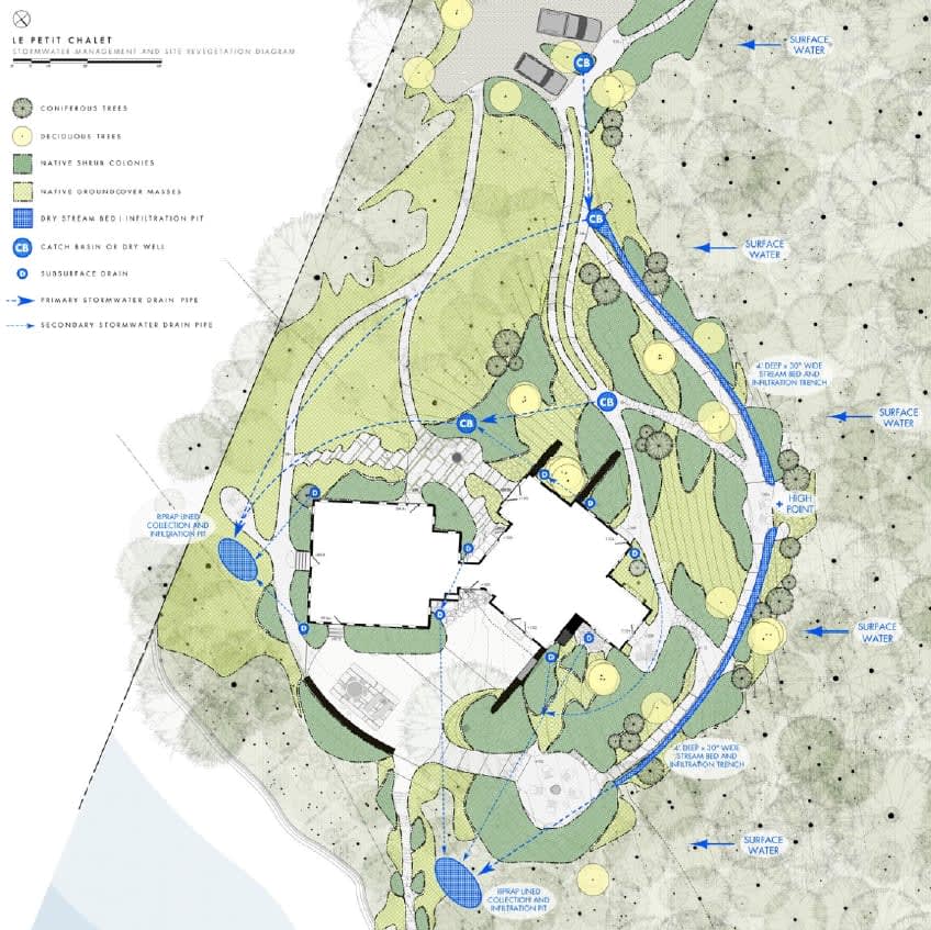 Le Petit Chalet :この設計には、流域パターンやドライクリークベッド(乾いた川床)、雨水集水システムが組み込まれており、持続可能な水管理を促進しています。木道や林の中の小径は環境への影響を最小限に抑え、他の生物が妨げられることなく生き生きと育つよう配慮されています。